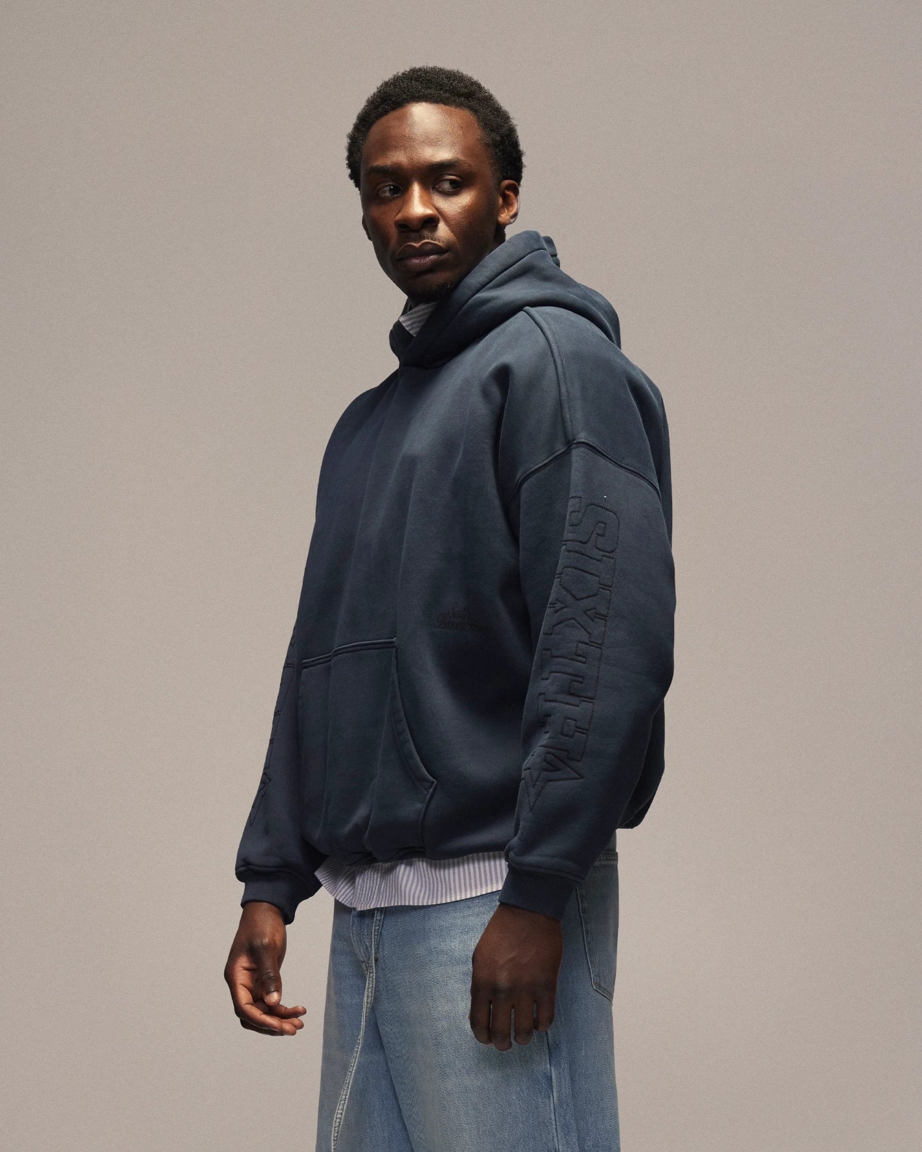 The heavyweight fabric gives the hoodie presence while remaining wearable and comfortable.